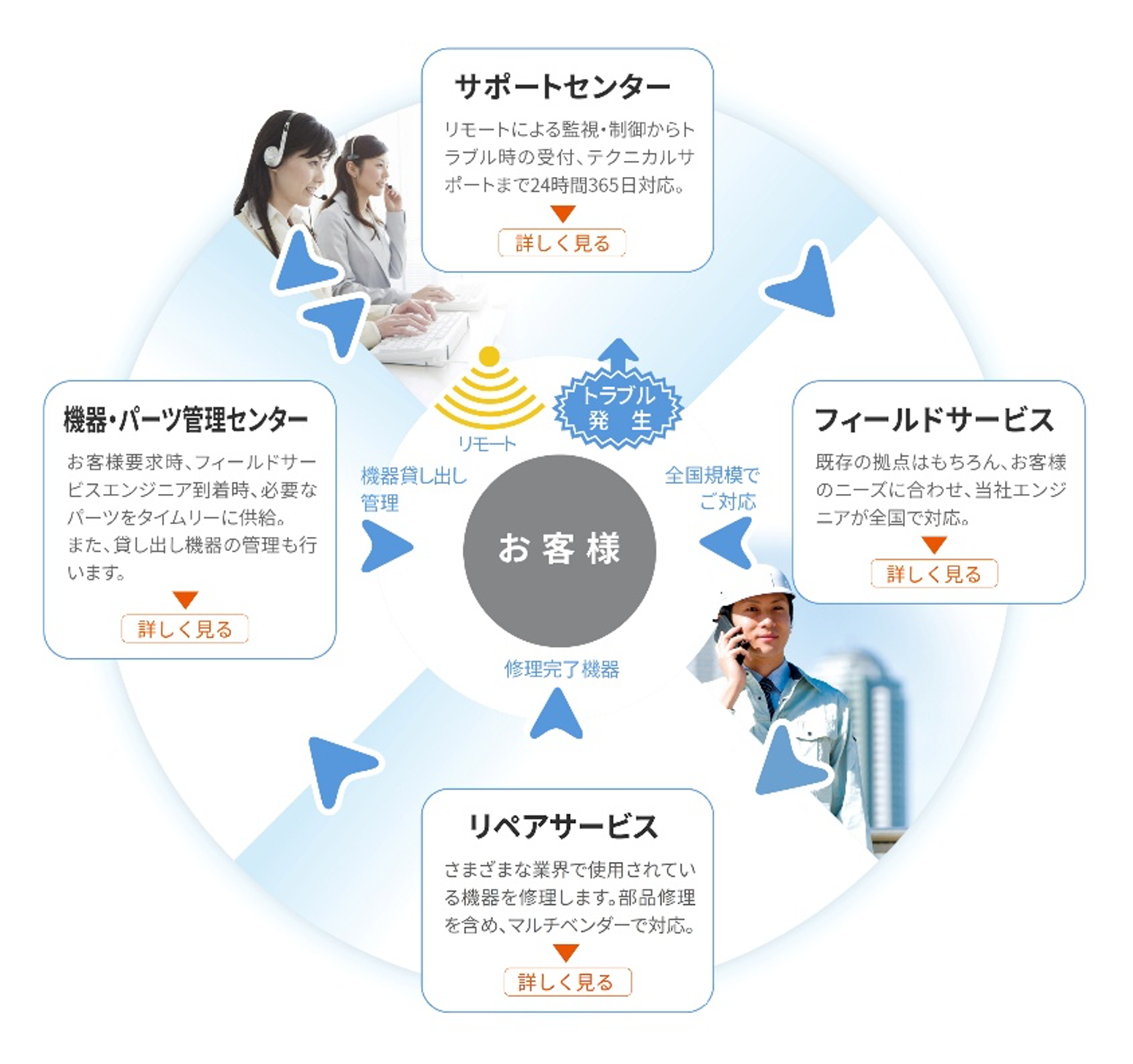 また、当社の標榜する「トータルマルチベンダーサービス」については、今後、一つの工場や病院、プラントの中で稼働している多種多様な機器のメンテナンスサービスを丸ごと提供していくという構想があります。京都には電子部品・精密機器の大手メーカーが本社を置いていますから、当社も京都に根を下ろして繋がりを持ち、ゆくゆくはサービスを通じてお力添えさせていただきたいと願っています。