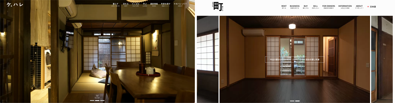 「伝統・文化×まちづくり」事業では、日本の伝統建築の魅力を伝える情報発信サイト「ケのハレ/KEnoHARE」(※1)、町家・古民家のマッチングサイト「デジタル町家バンク」(※2)、を運営しています。地域の文化を育んできた建物を残したい人と、そこに住みたい人をつなぐ活動を行っています。