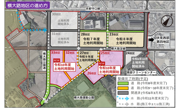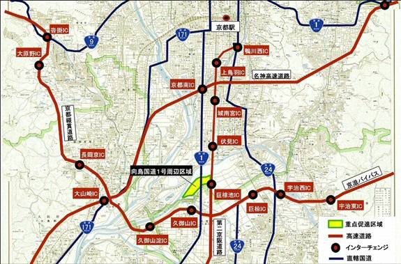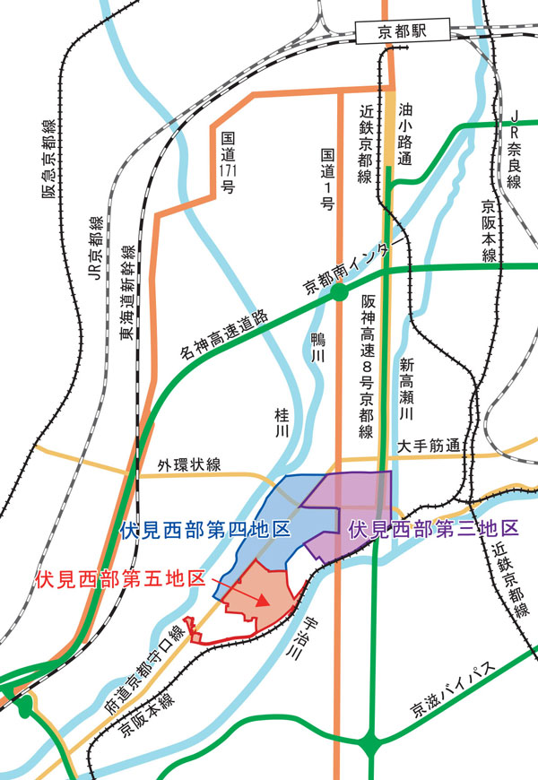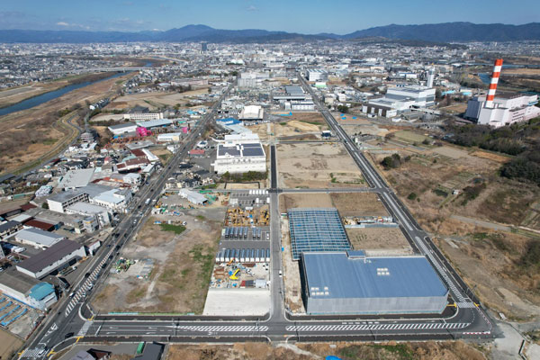 らくなん進都に連なる伏見・横大路エリアは、高速道路や主要幹線道路等へのアクセスが良好、大部分が工業地域、といった産業用地として活用しやすい環境が整っており、土地区画整理事業により3,000~6,000坪規模の街区整備を進めるなど、市内では希少なまとまった産業用地の創出が進んでいます。